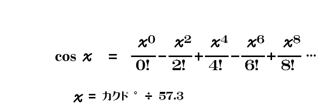 −100% 。3.141592653589..ラジアン。という しょうすうぶぶん が ムゲン につづく かず を こちらのしき のエックス において ムゲン 項 つづけていけば.. = -100% に なる みこみ となります。もちろん それを てけいさんで カンペキ に こなすのは 不可能 なので、とりあえず 6項 まで おいかけてみたいとおもいます。なお、ここでいう 3.14 は えんしゅうりつ (パイ) の きんじち となります。∠パイラジアンという カクド は つまり いいかえると ∠3.14..ラジアン の ことを いみしています。