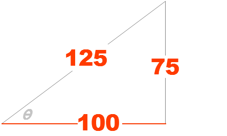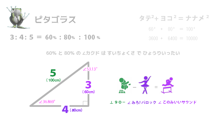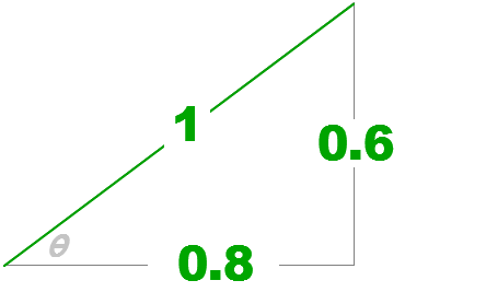 この カクド は 3:4:5 の ピタゴラス の サンカクケイ の するどい ほう の カクド になります。ここでは あつかいませんが、ひろいほう の カクド ( ∠53どくらい ) でも わかりやすい あたい がでてきます。