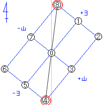 これにたいして ⑧ 山-1ミリ ヨ+1ミリ ちてん ④ 山+1ミリ ヨ-1ミリ ちてん ⑧ と ④ の かたむき が ▲ 北 N に わりと ちかく およそ 7 ど ほど の かたむき に なります。 |