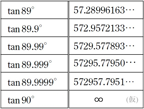 まで どこまでも、ふえつづけていくので、ムゲン (∞)。タンジェント90ど は =ムゲン でよくせっていされています。