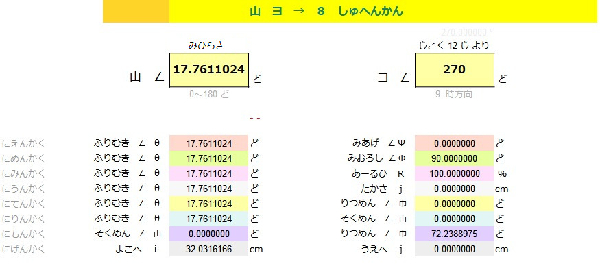 | りん ATAN √ ( TAN ( θ )^2 + TAN ( 山 )^2 ) ( θ ) シータ ひだりに ∠ 17.76 ど ( 山 ) ヤーマ うえ に ∠ 0.00 ど みひらき にりんかく ∠ 17.76 ど |