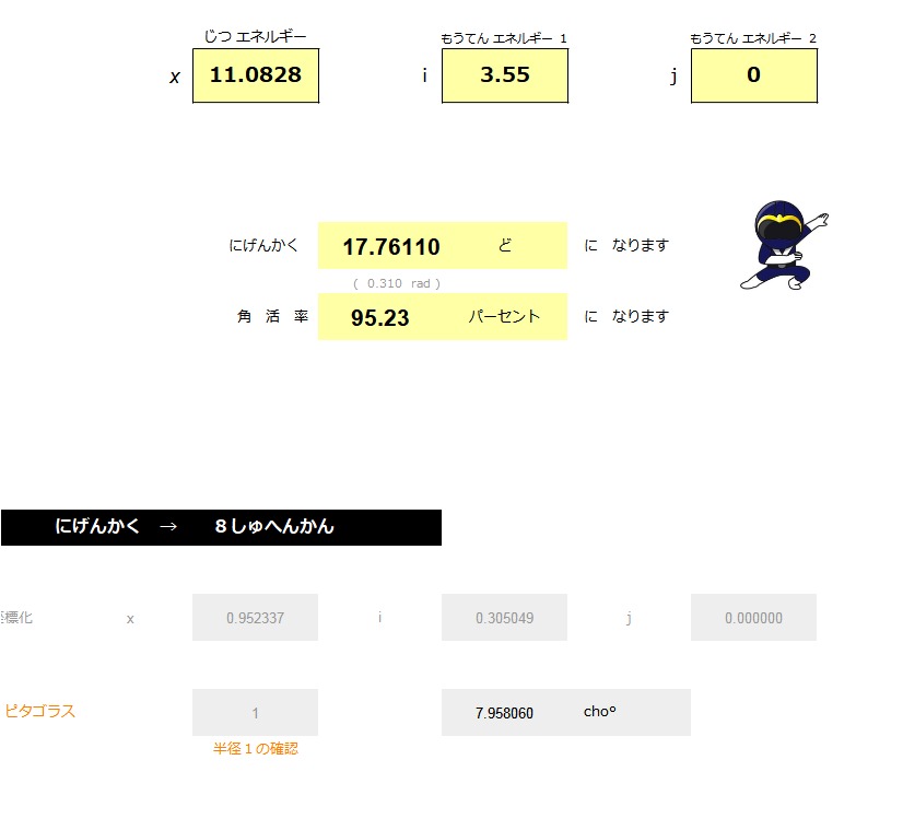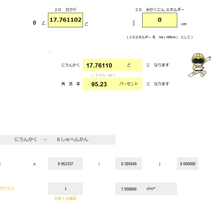 | うん ACOS ( COS ( θ ) ÷ √ ( 1 + j^2 )) ( θ ) シータ ひだりに ∠ 17.76 ど ( J ) うんジェイ たかさ 0.00 cm みひらき にうんかく ∠ 17.76 ど |