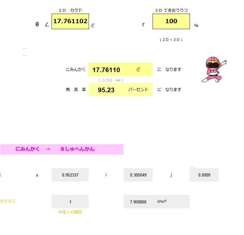 | みん ACOS ( COS ( θ ) * R ) ( θ ) シータ ひだりに ∠ 17.76 ど ( R ) アール ななめひ 100.00 % みひらき にみんかく ∠ 17.76 ど |