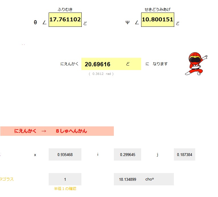 | えん ACOS ( COS ( θ ) * COS ( Ψ )) ( θ ) シータ ひだりに ∠ 17.76 ど ( Ψ ) プサイ うえ に ∠ 10.80 ど みひらき にえんかく ∠ 20.69 ど |