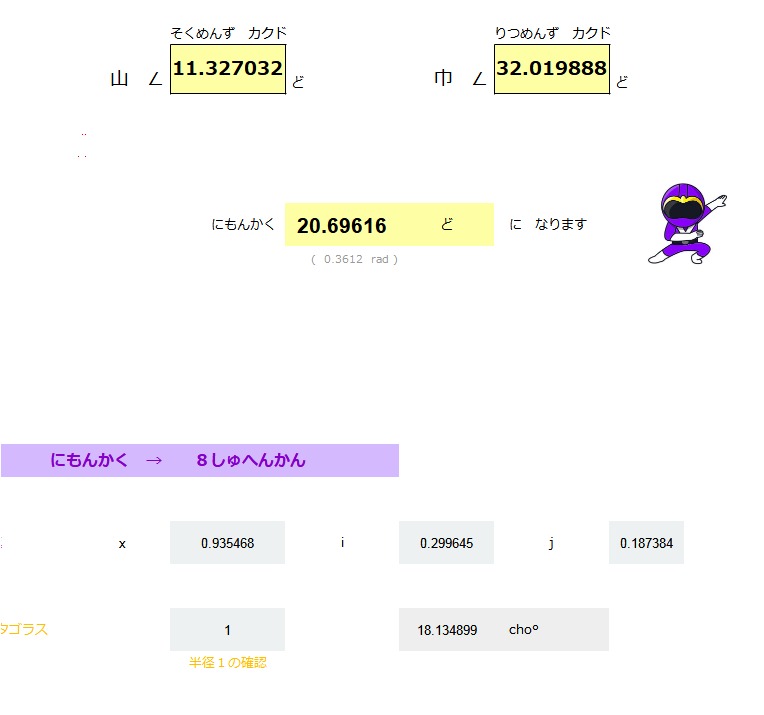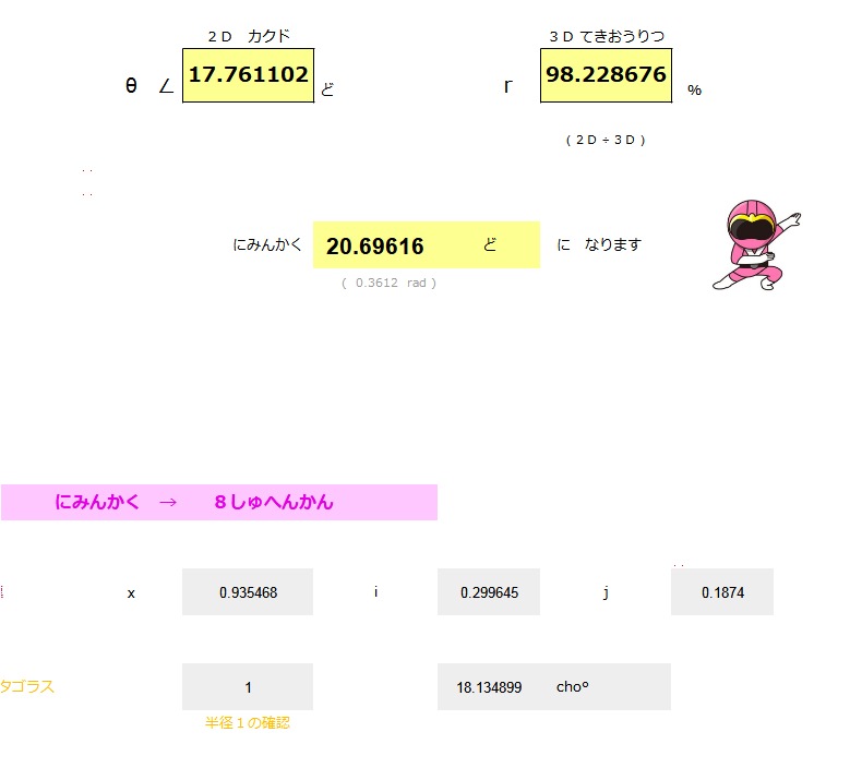| めん ACOS ( COS ( θ ) * SIN ( Φ )) ( θ ) シータ ひだりに ∠ 17.76 ど ( Φ ) ファイ みおろし ∠ 79.20 ど みひらき にめんかく ∠ 20.69 ど |