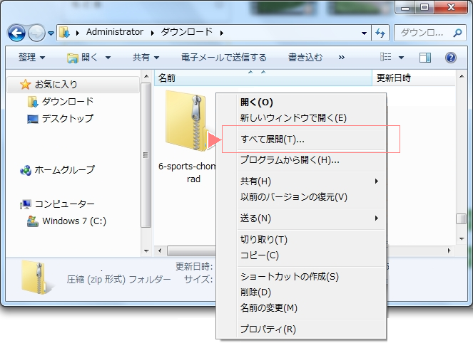 ⑤ 右 クリック の メニュー から、 「 すべて 展開 (T)... 」 を えらびます。 |