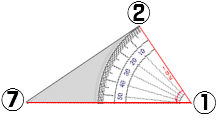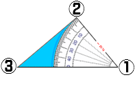 ベースシート1 の あおいろ と ベースシート3 の あおいろ の ていへん が かさなる ことを かくにん します ここでは この ながさ の ことを 2DR ( つーでぃーあーる ) と よぶことに しておきます つぎに ベースシート1 の はいいろ と ベースシート3 の ももいろ の ていへん が かさなる ことを かくにん します ここでは この ながさ の ことを 3DR ( すりーでぃーあーる ) と よぶことに しておきます ももいろ めもり で はかる あおいろ の せん と ももいろ の せん の ながさ を みくらべます あおいろ の せん が ももいろ の せん の 9 ほんめ ( 90 % ) の すぐてまえ ( 88 % ) あたり まで きている ことを かくにん します |