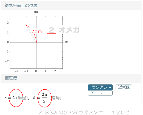 ラジアン ▼ r = 2 ( はんけい ) , θ = ∠ 3 ぶんの 2 ぱい (かくど)↑ こう なっていたら、 2 オメガ と なります ... |