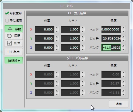 ピッチ ∠ 26.56° バンク ∠ - 41.81° ∠ メモ
