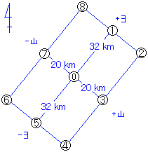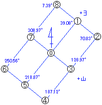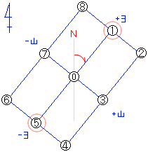 これにたいして ⑧ 山-1ミリ ヨ+1ミリ ちてん ④ 山+1ミリ ヨ-1ミリ ちてん ⑧ と ④ の かたむき が ▲ 北 N に わりと ちかく およそ 7 ど ほど の かたむき に なります。 |