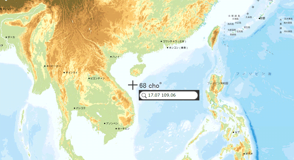 | ベトナム 東 | 109.060 ど | 17.073 ど | 68.001000504297 cho° |