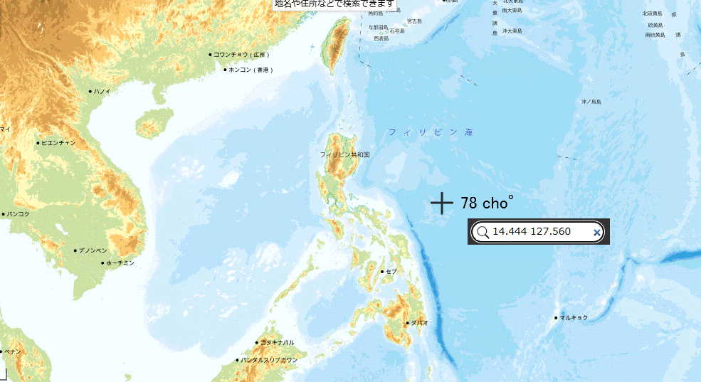 | フィリピン 海 | 127.560 ど | 14.444 ど | 78.000090909191 cho° |
