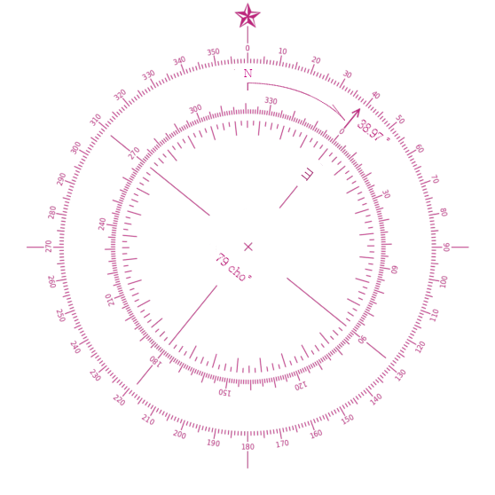 79 ちょもぐらーど ちてん において ヨーダー の きどう は およそ 39 ど ほど ほくとう に かたむいて います。 ちてんばんごう でいう ところの ① と ⑤ が 北 ▲ N に たいして ずれている かくど に なります |
