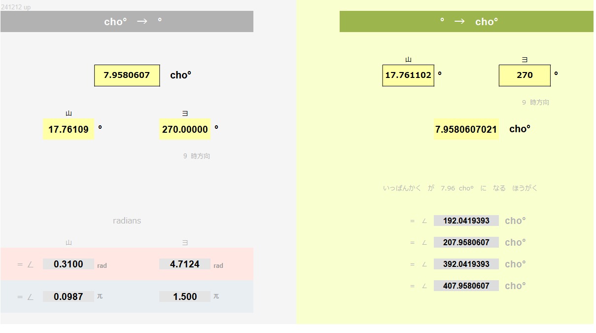 | てん ACOT ( COT ( θ ) * COS ( 巾 )) ( θ ) シータ ひだりに ∠ 17.76 ど ( 巾 ) ハーバ うえ に ∠ 0.00 ど みひらき にてんかく ∠ 17.76 ど |