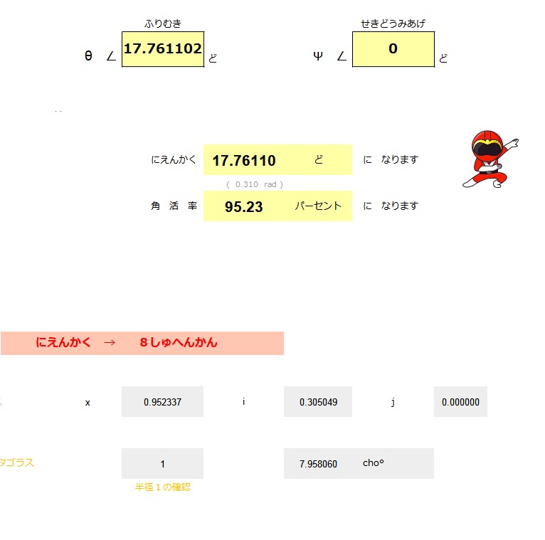 | うん ACOS ( COS ( θ ) ÷ √ ( 1 + j^2 )) ( θ ) シータ ひだりに ∠ 17.76 ど ( J ) うんジェイ たかさ 0.00 cm みひらき にうんかく ∠ 17.76 ど |