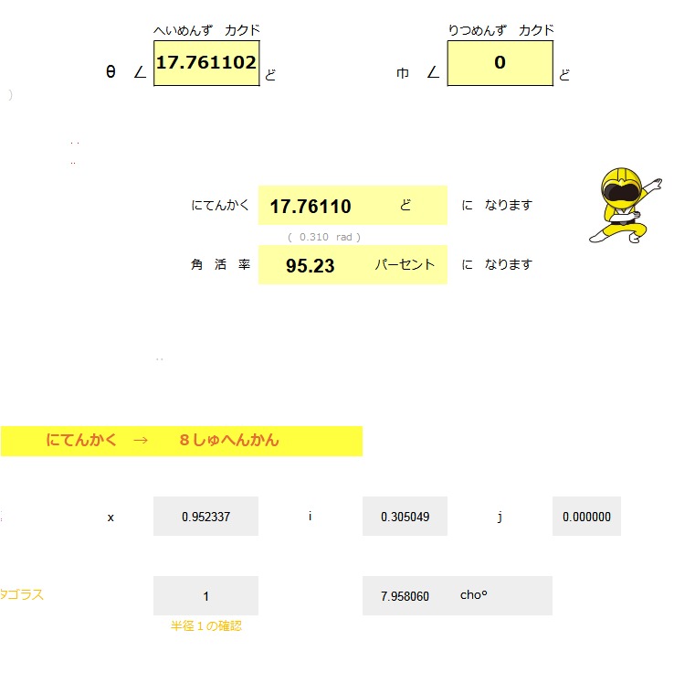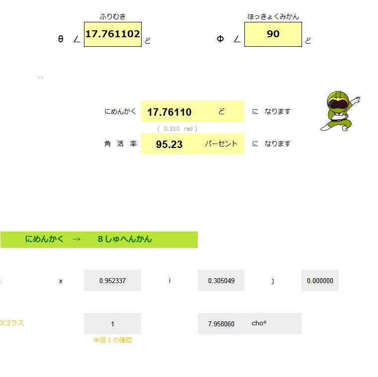 | めん ACOS ( COS ( θ ) * SIN ( Φ )) ( θ ) シータ ひだりに ∠ 17.76 ど ( Φ ) ファイ みおろし ∠ 90.00 ど みひらき にめんかく ∠ 17.76 ど |