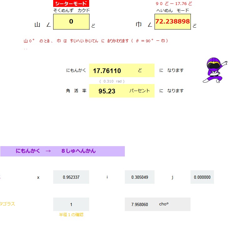 | もん ACOT ( COT ( 山 ) * SIN ( 巾 )) ( 山 ) ヤーマ うえ に ∠ 0.00 ど ( 巾 ) ハーバ モード切替 ∠ 72.23 ど みひらき にもんかく ∠ 17.76 ど |