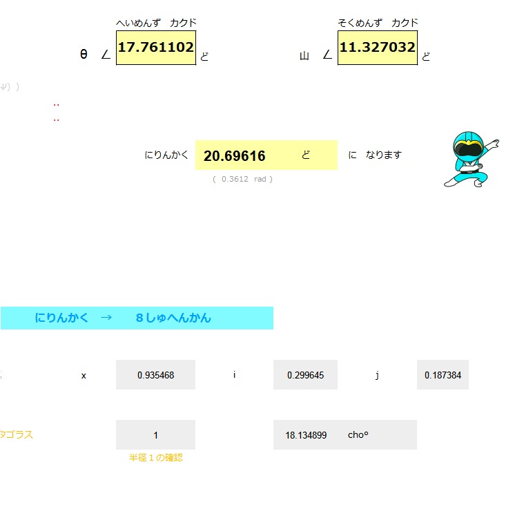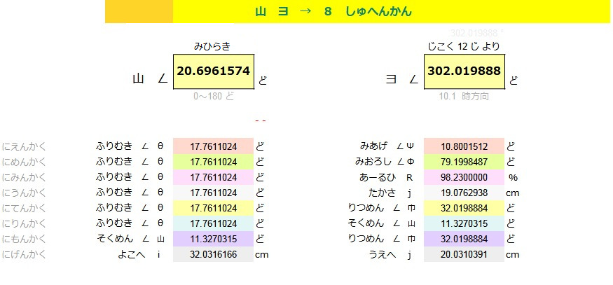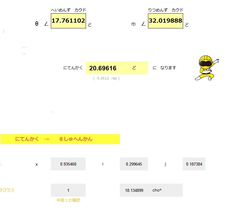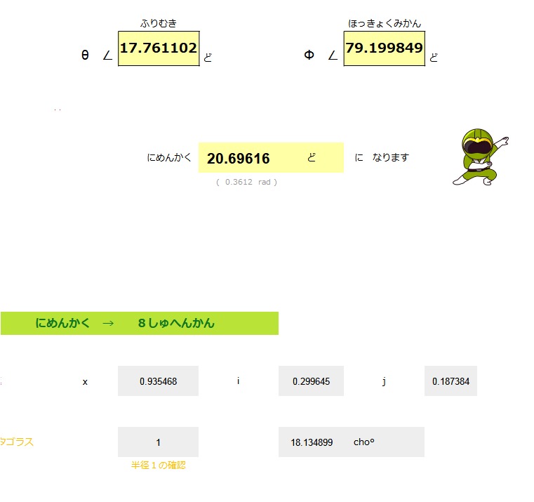| めん ACOS ( COS ( θ ) * SIN ( Φ )) ( θ ) シータ ひだりに ∠ 17.76 ど ( Φ ) ファイ みおろし ∠ 79.20 ど みひらき にめんかく ∠ 20.69 ど |