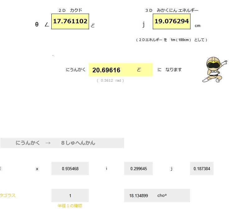 | うん ACOS ( COS ( θ ) ÷ √ ( 1 + j^2 )) ( θ ) シータ ひだりに ∠ 17.76 ど ( J ) うんジェイ たかさ 19.07 cm みひらき にうんかく ∠ 20.69 ど |