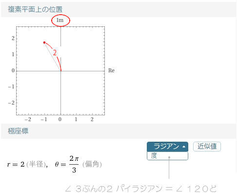 | へんかく の 120 ど (2/3兀ラジアン) は ぱっとみ ふくそ へいめん( ×ᐂ ) の ∠ へんかく のように みえます。 が 、 これは ふくそ くうかん(×ij) の ( へんかくではなく →∠チョモアーク3D) ∠ みひらき と いえます。 ( ∠ マイナス かいてん は ありません ) |